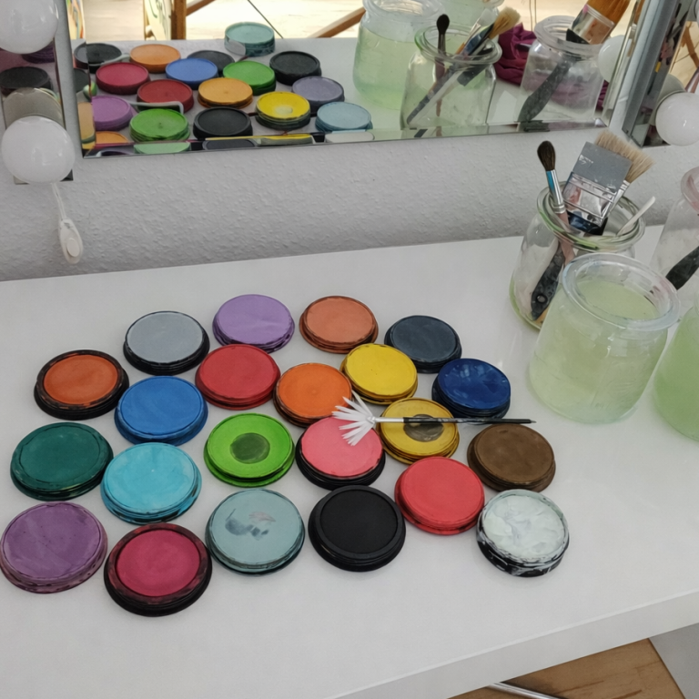 Für die Gestaltung verwende ich dermatologisch getestete Körperfarben, die wie Wasserfarben aufgetragen werden. Sie kleben nicht, blättern nicht ab und sind nach dem Trocknen unter Kleidung abriebfest, sodass du sogar direkt danach nach Hause gehen kannst.