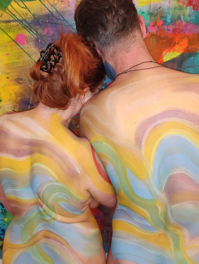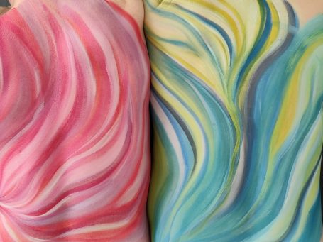 Dein Körper wird zu meiner Leinwand. Ich bemale Vorder- und Rückseite deines Oberkörpers – manchmal auch Arme, Hals oder Gesäß – und lasse dabei Formen und Farben intuitiv entstehen.